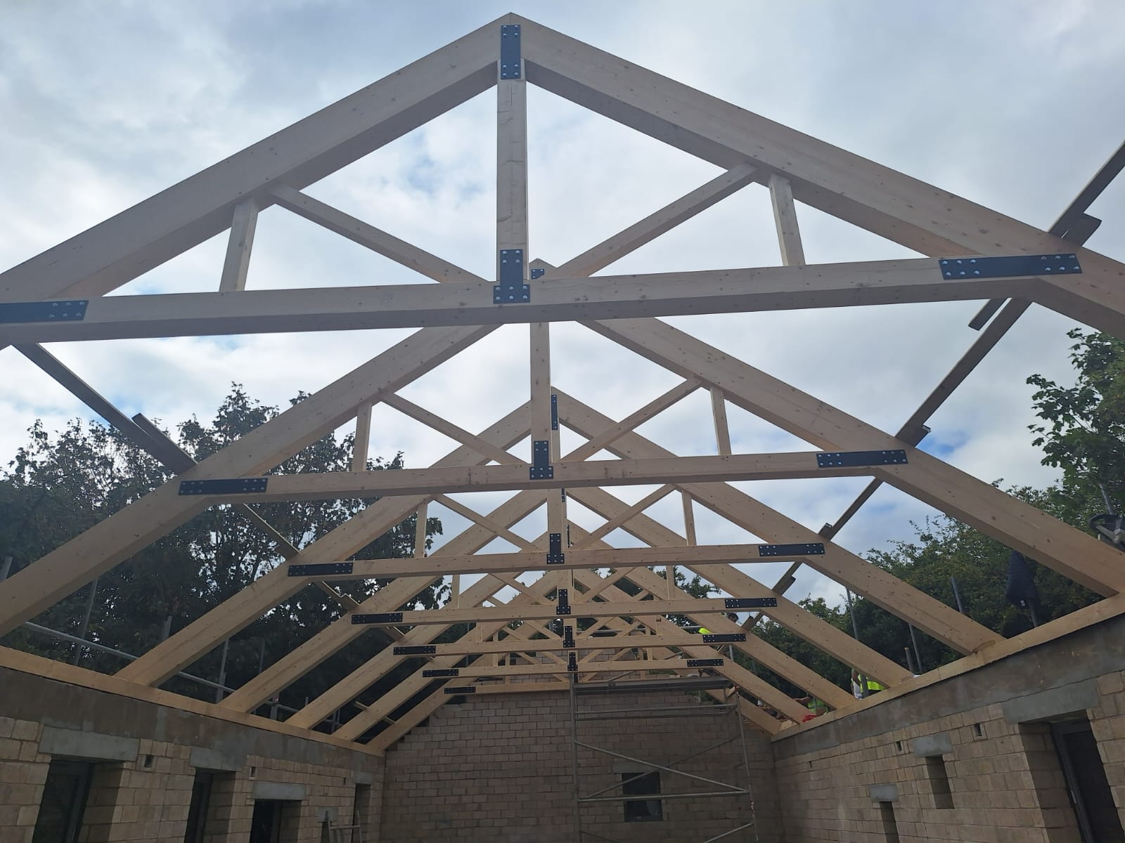 Pre-formed trusses aligned and anchored with bracketed ties; membrane applied for long-term water ingress protection
